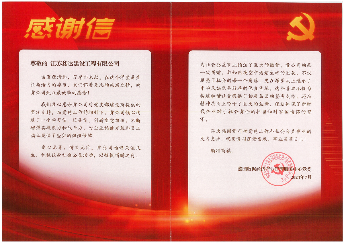 八一建軍節前夕,公司收到來自無錫蠡園開發區數據經濟產業管理服務中心黨委的感謝信,感謝公司對黨建工作和社會公益事業的大力支持。
